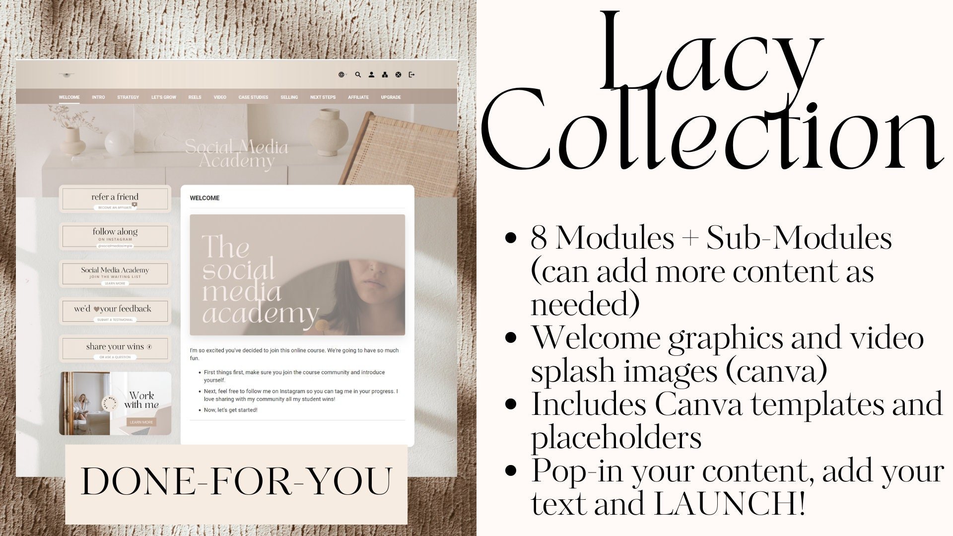 This bundle now includes a full done-for-you membership / course template, 2 student surveys, all your opt-in pages, a full website, blog home page, blog post page, a shop page, a freebie opt-in page and thank you page, a course resources page, a testimonial page, affiliate page, a podcast library page and more!