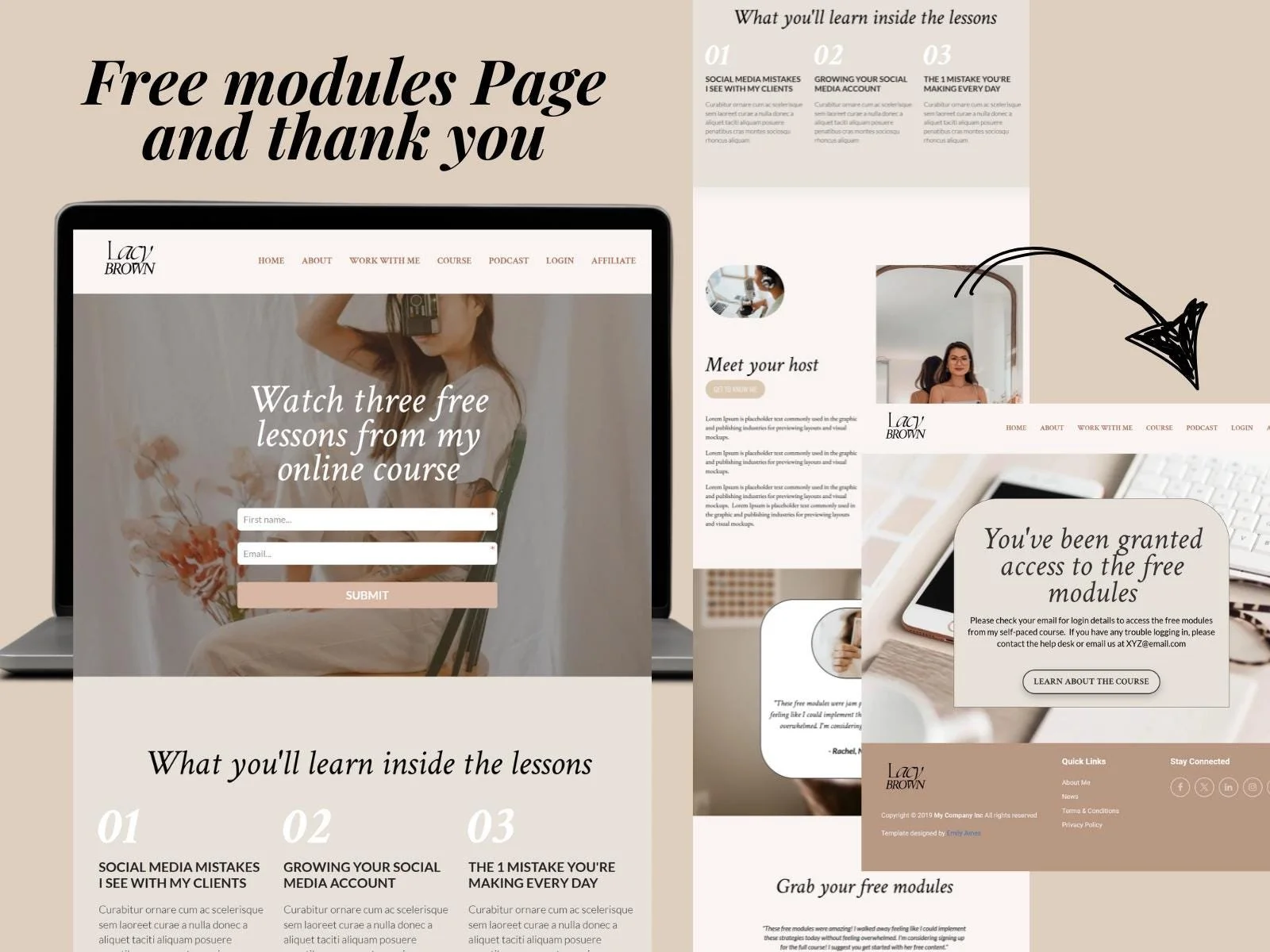 Everything you need to build your online course, website, sales pages, and opt-ins! Specifically designed to save you time launching your online course. I've done all the leg-work... just add your copy, change out the images (or keep them), add your brand colors and voila! You've got your course and business pages all set up.